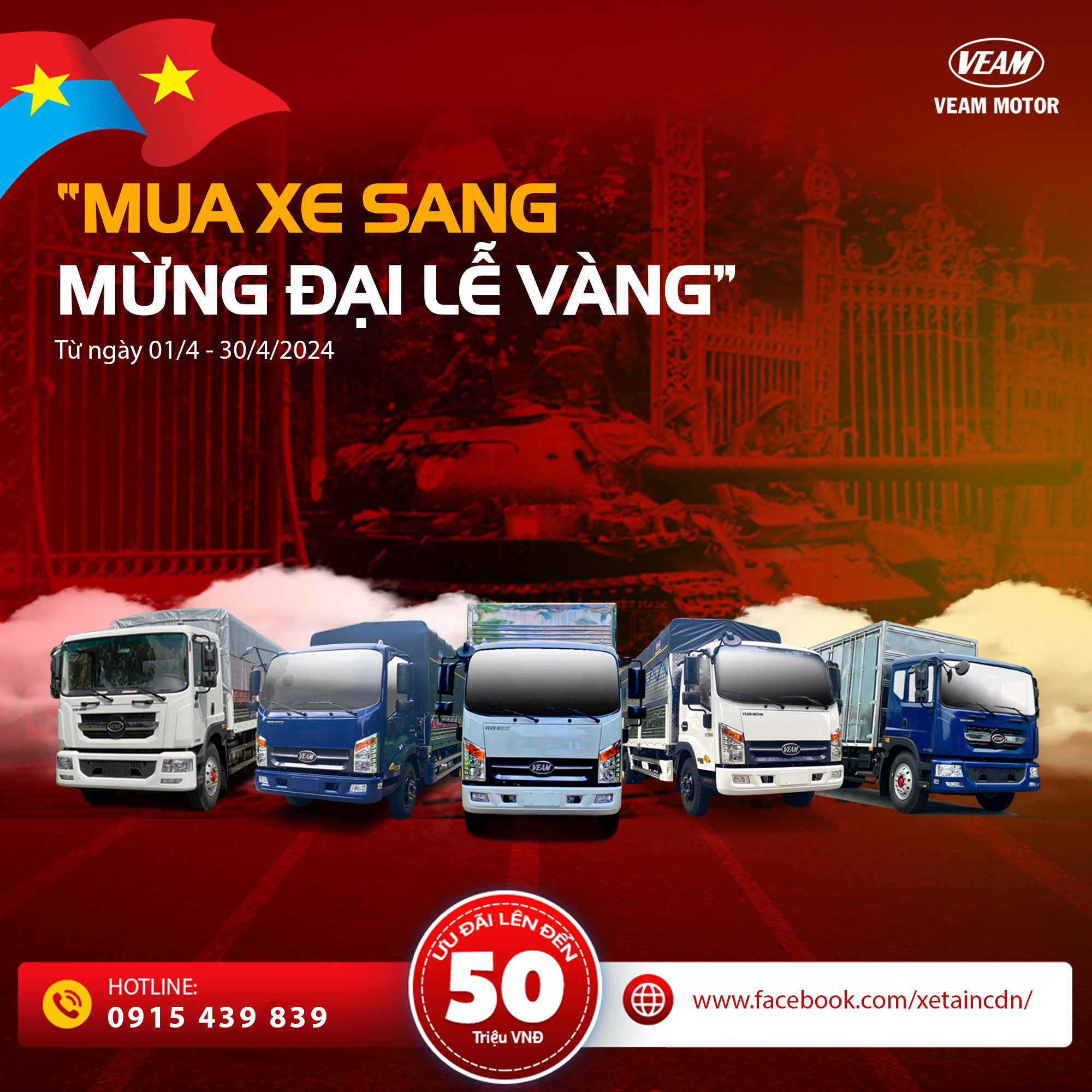 Nhân dịp chào mừng các ngày lễ lớn của Đất nước, ngày giỗ tổ Hùng Vương 10/3, 49 năm ngày giải phóng Miền Nam thống nhất Đất nước (30/4/1975-30/4/2024). VEAM MOTOR triển khai chương trình khuyến mại tri ân khách hàng “Mua xe sang – Mừng đại lễ vàng”: